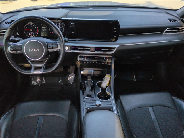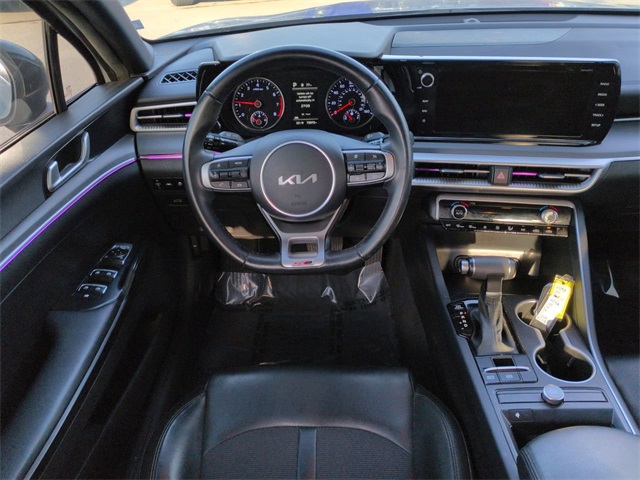 This 2022 Kia K5 GT-Line in Wolf Gray features: 4D Sedan, I4, 8-Speed Automatic, FWD, 10.25" Color Touchscreen, 4-Wheel Disc Brakes, 6 Speakers, 8" Color Touchscreen, ABS brakes, AM/FM radio: SiriusXM, Android Auto, Apple Carplay, Apple CarPlay & Android Auto, Auto Emergency Braking, Auto High-beam Headlights, Auto LED Headlights, Automatic temperature control, Backup Camera, Blind Spot Monitoring, Bluetooth w/ Audio Streaming, Brake assist, Delay-off headlights, Driver Attention Warning, Electronic Stability Control, Four wheel independent suspension, Foward Collison Alert, Front Center Armrest, Front dual zone A/C, Front fog lights, Fully automatic headlights, Heated door mirrors, Illuminated entry, Lane Departure Warning, Lane Keeping System, LED Foglights, Low tire pressure warning, Navigation System, Outside temperature display, Overhead console, Panic alarm, Parking Sensors, Power door mirrors, Power driver seat, Power Mirror Package, Power Package, Power steering, Power windows, Push Button Start, Radio data system, Radio: AM/FM/MP3 Audio System, Rear Cross Traffic Alert, Remote keyless entry, Remote Start, Reverse Brake Assist, Reverse Sensing, Safety Package, Security system, Speed control, Speed-sensing steering, Split folding rear seat, Spoiler, Sport steering wheel, Steering wheel mounted audio controls, Telescoping steering wheel, Tilt steering wheel, Traction control, Trip computer, Turn signal indicator mirrors, Variably intermittent wipers, Wheels: 7.5J x 18" Gloss Black Machined Finish Alloy, Wireless Charging Pad.