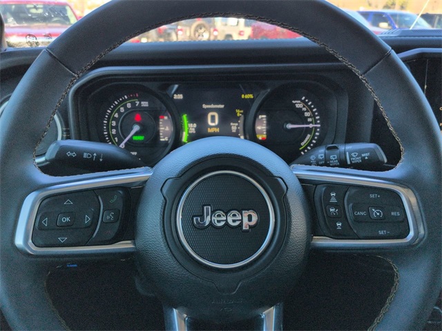 This 2024 Jeep Wrangler Sahara 4xe in Bikini Pearl Coat features: 4D Sport Utility, 2.0L I4 DOHC, 8-Speed Automatic, 4WD, 12.3" Touchscreen Display, 3rd Generation Heavy-Duty Dana 44 Axles, 4-Wheel Disc Brakes, 4G LTE Wi-Fi Hot Spot, 4G WiFi Hotspot Telematics, 8 Speakers, ABS brakes, Adaptive Cruise Control, Android Auto, Apple Carplay, Apple CarPlay/Android Auto, Automatic temperature control, Backup Camera, Bluetooth w/ Audio Streaming, Body Color 3-Piece Hard Top, Brake assist, Cloth Low-Back Bucket Seats, Cold Weather Package, Compass, Delay-off headlights, Electronic Stability Control, Emergency communication system: Jeep Connect, Freedom Panel Storage Bag, Front Center Armrest w/Storage, Front fog lights, Front Pedestrian Braking, Full Speed Auto Collision Warning Plus, Fully automatic headlights, Google Android Auto, Heated door mirrors, Heated front seats, Heated steering wheel, Illuminated entry, Integrated Center Stack Radio, Integrated roll-over protection, Integrated Voice Command w/Bluetooth, Leather Seats, LED Foglights, Low tire pressure warning, MOPAR All-Weather Floor Mats, No Soft Top, Outside temperature display, Panic alarm, ParkView Rear Back-Up Camera, Power door mirrors, Power Mirror Package, Power Package, Power steering, Power windows, Preferred Equipment Package, Push Button Start, Quick Order Package 29P Sahara, Radio data system, Radio: Uconnect 5 w/12.3" Display, Rear seat center armrest, Rear Window Defroster, Rear Window Wiper/Washer, Regenerative Anti-Lock 4-Wheel Disc Brakes, Remote keyless entry, Remote Start, Security system, Split folding rear seat, Sport Package, Sport Suspension, Steering wheel mounted audio controls, Telescoping steering wheel, Traction control, Variably intermittent wipers, Wheels: 20" x 8" Painted Black Aluminum.