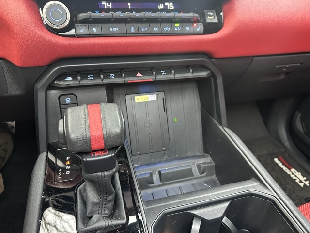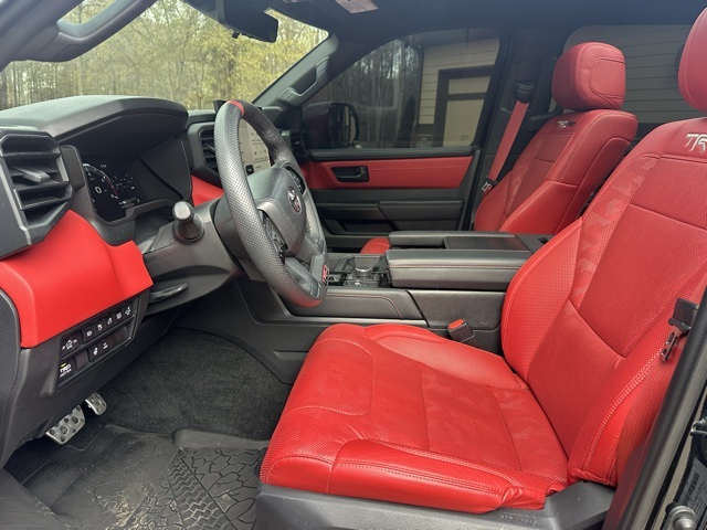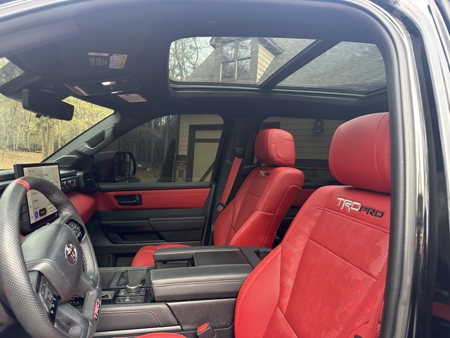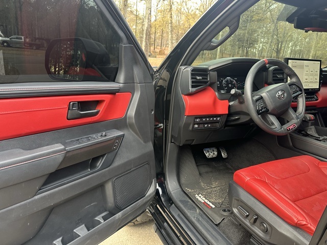 This 2024 Toyota Tundra Hybrid TRD Pro in Midnight Black Metallic features: 4D Crew Cab, 3.4L V6, 10-Speed Automatic, 4WD, 12 Speakers, 12.3" HD Color Driver Cluster, 14" Color Touchscreen, 4-Wheel Disc Brakes, ABS brakes, Adaptive Cruise Control, AM/FM radio: SiriusXM, Android Auto, Apple Carplay, Apple CarPlay/Android Auto, Auto Emergency Braking, Auto High-beam Headlights, Auto LED Headlights, Auto-dimming Rear-View mirror, Automatic temperature control, Backup Camera, Bluetooth w/ Audio Streaming, Brake assist, Delay-off headlights, Electronic Stability Control, Emergency communication system: Safety Connect (10-year trial), Exterior Parking Camera Rear, Front Center Armrest, Front dual zone A/C, Front fog lights, Front Pedestrian Braking, Front wheel independent suspension, Fully automatic headlights, Garage door transmitter: HomeLink, Heated & Ventilated Front Bucket Seats, Heated door mirrors, Heated front seats, Heated steering wheel, Illuminated entry, Lane Departure Warning, Lane Tracing Assist, Leather Shift Knob, Low tire pressure warning, Memory Package, Memory seat, Navigation System, Off Road Package, Outside temperature display, Overhead console, Panic alarm, Panoramic Sunroof/Moonroof, Power door mirrors, Power driver seat, Power moonroof, Power steering, Power windows, Pre-Collision w/ Pedestrian Detection, Predator Pro Step Bar, Premium Audio Package, Premium Sound Package, Pro Trailer Backup Assist, Pro Trailer Hitch Assist, Radio data system, Radio: Premium Audio w/JBL, Rear seat center armrest, Rear step bumper, Remote keyless entry, Security system, Skid Plate Package, SofTex Seat Trim, Speed control, Speed-sensing steering, Split folding rear seat, Sport steering wheel, Steering wheel mounted audio controls, Telescoping steering wheel, Tilt steering wheel, Toyota Safety Sense, Traction control, Traffic Sign Recognition, TRD Package, Trip computer, Turn signal indicator mirrors, Variably intermittent wipers, Ventilated front seats, Wheels: 18" x 8" Black BBS Forged Aluminum.